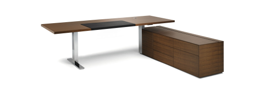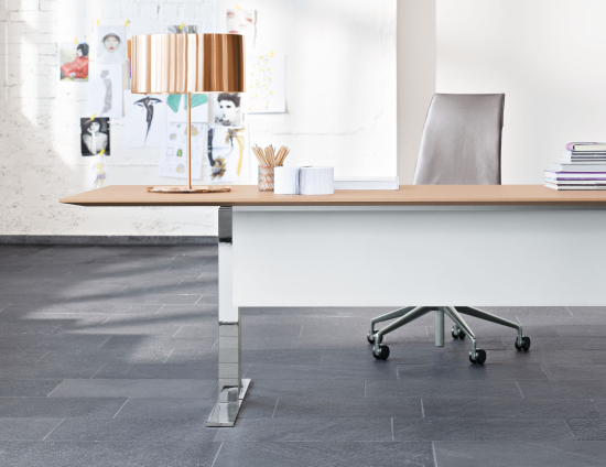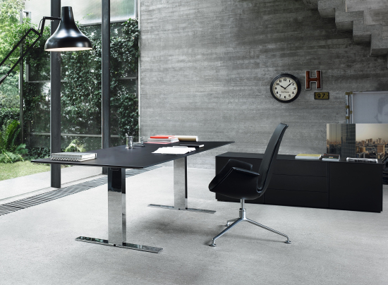 Der Exec-V Schreibtisch ist auf repräsentative Führungsarbeitsplätze ausgerichtet. Die Tischplatte scheint auf Fuss und Container zu schweben. Ein Eindruck, der durch die präzisen Proportionen und das hochglanz-verchromte Untergestell entsteht. Zwei Plattenvarianten stehen zur Wahl, die dem Tisch je einen eigenen Charakter geben – schlanker und leichter mit abgeschrägter Kante oder massiver und präsenter mit gerader Kante. Optional ist eine motorische Höhenverstellung erhältlich, die das Arbeiten im Stehen ermöglicht. Das Programm umfasst passende Container, Sideboards und Highboards, die sich nahtlos in ein durchgängiges Bürokonzept einfügen.