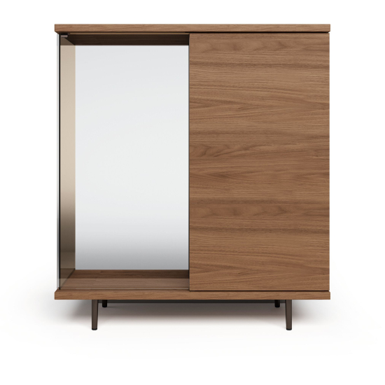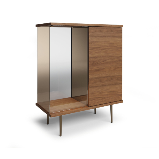 The Farns Highboard nimmt die Gestaltungsidee der gesamten Farns-Kollektion und streckt sie in die Vertikale. Mit einer Höhe von 135 cm markiert es den Raum deutlich stärker als die flacheren Geschwister und entwickelt eine Präsenz, die zwischen Möbel und Rauminstallation pendelt. Die Kombination aus furniertem Holz und Sicherheitsglas, verspiegelten Innenwänden und dem um 180 Grad öffenbaren Türsystem bleibt dabei dieselbe wie bei den Sideboard-Varianten. Freistehend wirkt das Highboard von allen Seiten – als Raumteiler, als Lichtkörper mit optionalem Lichtpaket oder als grosszügige Stauraumlösung für Wohn-, Empfangs- und Konferenzräume.