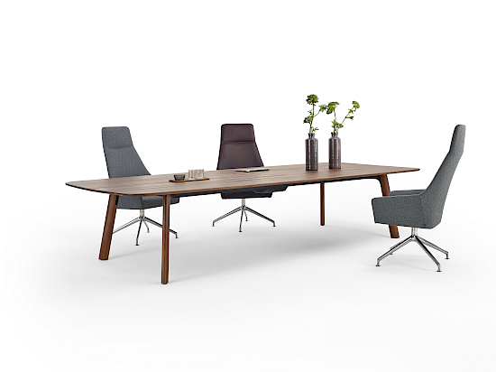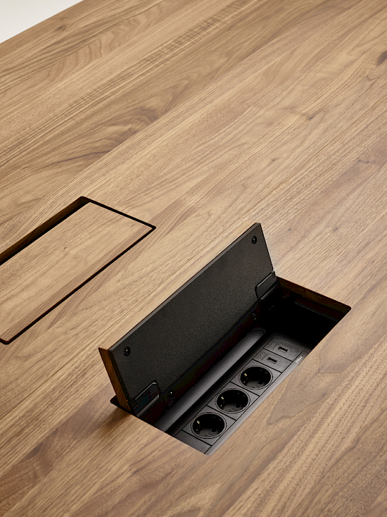 Man kann den Tisch Grid Work mittels zusätzlicher Tischbeine und Tischplatten auch ausbauen. Damit lässt sich je nach Bedarf eine Vielzahl von Grössen erreichen. Dadurch eignet sich dieser Tisch auch perfekt für Versammlungen mit einer grösseren Gruppe. Alle erforderlichen Anschlüsse wie Steckdosen, Datenanschlüsse und USB-Ports sind in die Tischplatte integriert und nahezu unsichtbar unter einer zur Holzoptik passenden Abdeckung verborgen.