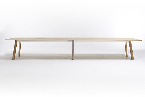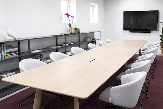 Man kann den Tisch Grid Work mittels zusätzlicher Tischbeine und Tischplatten auch ausbauen. Damit lässt sich je nach Bedarf eine Vielzahl von Grössen erreichen. Dadurch eignet sich dieser Tisch auch perfekt für Versammlungen mit einer grösseren Gruppe. Alle erforderlichen Anschlüsse wie Steckdosen, Datenanschlüsse und USB-Ports sind in die Tischplatte integriert und nahezu unsichtbar unter einer zur Holzoptik passenden Abdeckung verborgen.