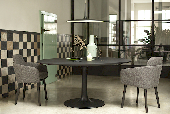 Der Tisch Joist ist dank seiner runden Form ein echtes Urmodell. Durch die zentrale Säule gibt es viel Bein- und Bewegungsfreiheit. Die runde Form macht den Joist zu einem sozialen Tisch: Alle können einander ansehen. Die zentrale Säule besteht aus massiver Eiche oder Nussbaum. Sie steht auf einem Fuss aus Aluminium. Das Aluminium, das für diesen Tisch verwendet wurde, wird von einem niederländischen Partner geliefert. Joist wurde anhand des Prinzips „Design to disassembly“ entworfen: Der Tisch kann vollständig demontiert werden, wodurch alle Bestandteile wiederverwertbar sind. Man kann sowohl die massive Holzplatte, als auch die Säule nach Ablauf der Nutzungsdauer aufarbeiten.
