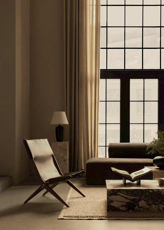 Als der visionäre Architekt und Designer Mogens Lassen 1955 den Saxe-Stuhl für die Kopenhagener Ausstellung der Tischler entwarf, wurde seine Form als zu modern und kühn angesehen. Der scherenartige Gestell aus Eichenholz mit einem über die Form schwebenden Ledersitz war für damalige Entwürfe untypisch. Und seine Eigenschaft bei Nichtgebrauch zusammengeklappt zu werden, war ein Konzept, das noch nicht im Mainstream Zustimmung fand. Der Saxe Lounge Chair ist jedoch ein echtes Beispiel dafür, wie Ästhetik und Funktion Hand in Hand gehen. Lassens Blick fürs Detail überliess nichts dem Zufall und seine Entschlossenheit, neue Wege zu gehen, ist auch heute noch ikonisch. Minimalistisch und doch unverwechselbar, verbindet er gekonnt natürliche Materialien mit grosszügigem Sitzkomfort. Der geschwungene Ledersitz umarmt den Sitzenden, während das Gestell aus Eichen-Kernholz mit Messingbeschlägen eine stabile Basis mit minimalem Platzbedarf bietet. Mogens Lassen entwarf auch den Saxe Hang Up, eine Eichenholzhalterung, die den Stuhl an der Wand aufhängt, wenn er nicht benutzt wird.
