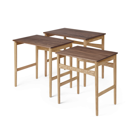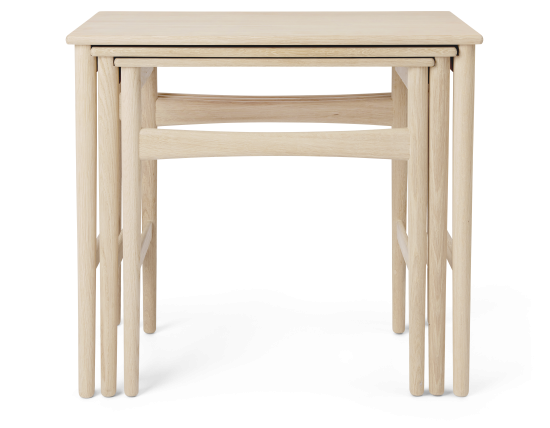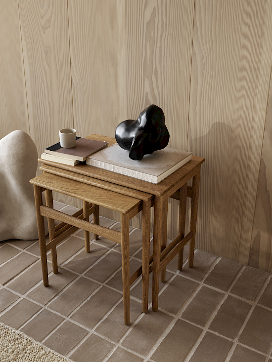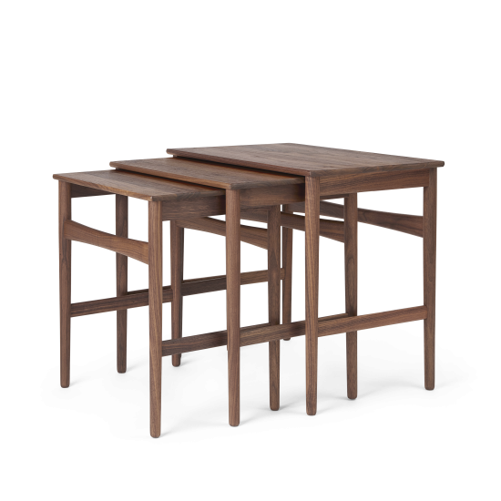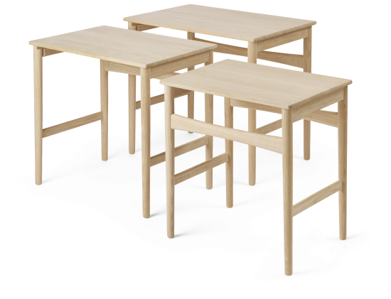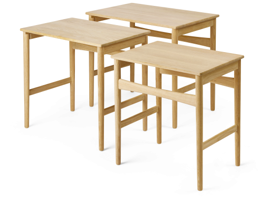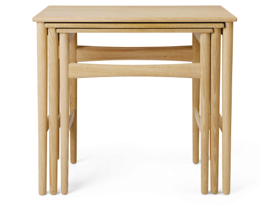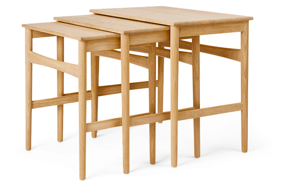 Hans J. Wegner war dafür bekannt, ein Möbelstück so einfach und funktional wie möglich zu gestalten und gleichzeitig Harmonie und Ästhetik in Bezug auf Dimensionen und Materialien zu schaffen. Die Nesting Tables bilden hier keine Ausnahme. Die drei Satztische sind so skaliert, dass sie perfekt zusammenpassen und gleichzeitig leicht mit anderen Möbeln kombiniert werden können, entweder als Beistelltisch oder auch als kleiner Couchtisch. Die Nesting Tables weisen deutliche Wegner-Details auf, wie die runden, nach unten spitz zulaufenden Tischbeine, die klassischen Zapfenverbindungen und die harmonischen Bögen der vorderen und hinteren Zargen, die für einen organischen und zeitlosen Ausdruck sorgen.