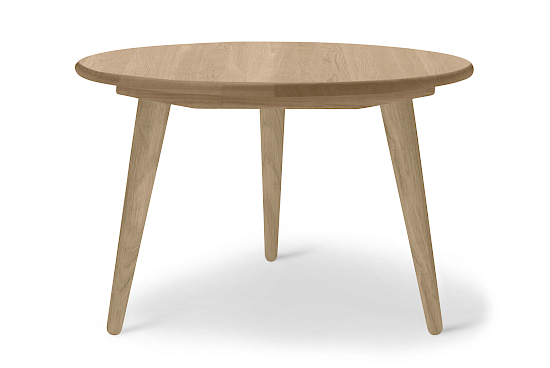 Der CH008 ist ein perfektes Beispiel für Hans J. Wegners Vorliebe für einfache, klare und interessante Lösungen. Er besteht aus einer runden Tischplatte auf einem Gestell mit drei abnehmbaren, konischen Beinen. Zur Unterstützung der Tischplatte und als Bindeglied zwischen der Oberseite und den Beinen hat der Tisch einen massiven dreieckigen Rahmen, dessen Ecken an der Kante der Tischplatte schräg zugeschnitten sind. Die Rundung der Beine verleiht dem Couchtisch einen eleganten und fast schon schwebenden Look. Der schlichte und elegante CH008 Coffee Table aus Massivholz passt besonders gut zu anderen bekannten Stücken von Wegner, insbesondere seinen Lounge Chairs. Die massive Tischplatte mit abgerundeten Ecken ist in drei verschiedenen Grössen erhältlich. Die Beine gibt es in drei verschiedenen Höhen.