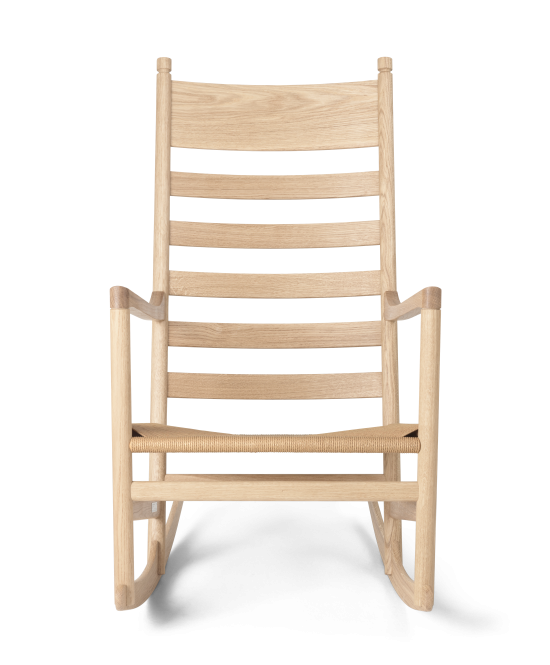Hans J. Wegner, mit rund 500 Entwürfen auch als „Master of the Chair“ bekannt, war fasziniert vom Konzept des Schaukelstuhls. Durch seine akribische Herangehensweise an das Design, das er auf das absolut Wesentliche in Bezug auf Komfort und Funktionalität reduzierte, entstand nach Jahren der ständigen Verfeinerung dieser faszinierende Schaukelstuhl für die Moderne. Der 1965 entworfene CH45 Rocking Chair ist Teil einer grösseren Serie, die Wegner für Carl Hansen & Søn entworfen hat, darunter der CH44 Lounge Chair, die Esszimmerstühle CH46 und CH47 und der CH53 Footstool. Der moderne Schaukelstuhl besticht durch die Eleganz seiner nordischen Schlichtheit, die von der Shaker-Ära inspiriert ist. Er hat ein Design mit zurückgeneigter Rückenlehne und einen Sitz aus gewebter Papierkordel, der sich in anderen Designs der Serie wiederholt. Mit seinen perfekten Proportionen hat der CH45 Rocking Chair einen dynamischen Ausdruck, der müheloses Sitzen, Schaukeln und Aufstehen ermöglicht.