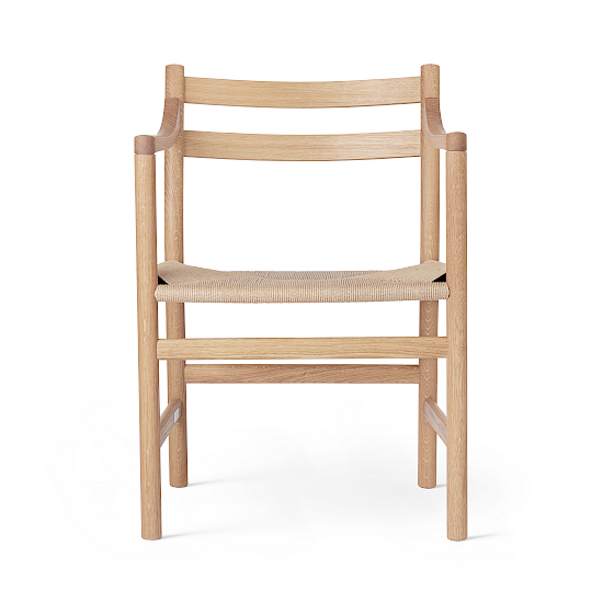 Hans J. Wegners CH46 Chair ist schlicht und funktional, aber gleichzeitig auch elegant. Eine sorgfältige Abstimmung zwischen Neigung und Proportion sorgte dafür, dass jeder Stuhl optimal für den menschlichen Körper geeignet war. Die geschwungenen hinteren Beine spielen bei der Konstruktion und Ausgewogenheit des Stuhls eine wichtige Rolle. Der nach hinten geneigte obere Teil sorgt für einen bequemen Winkel der Rückenlehne, während der Winkel des unteren Teils dafür sorgt, dass der Stuhl nicht nach hinten kippen kann. Der Stuhlsitz ist aus Papierkordel geflochten und die beiden Stangen der Rückenlehne sind aus 3 verschiedenen Holzstärken laminiert, die dann zu einer weichen, aber dennoch straffen Bogenform geformt werden. Auf der Vorderseite hat die Armlehne die gleiche elegante Rundung wie die vorderen Beine, während sie sich nach hinten hin leicht nach oben beugt, wo sie rückwärtig zwischen den beiden Stangen der Rückenlehne gut befestigt ist. Die Beine und Armlehnen haben eine leicht gewölbte Oberfläche. Die bequeme Armlehne, der gute Halt für den Rücken und der handgeflochtene Sitz aus Papierkordel sind alle in ein zeitloses Design integriert, das den CH46 komfortabel und geeignet für das Esszimmer, für Konferenzräume und für Wartezimmer macht. Der Stuhl ist ebenfall ohne Armlehnen mit Modellnummer CH47 erhältlich.