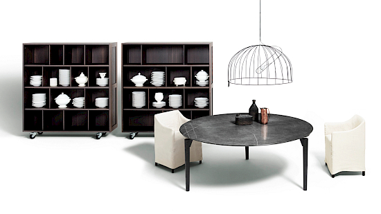 Dieses Stück von Achille Castiglioni ist ein echter Designklassiker. Die tragenden Elemente von Tavolo ’95 sind unsichtbar und die Materialien sind luxuriös und raffiniert. Die Marmor- oder Holzplatte scheint über dem stabilen, formschönen Sockel zu schweben, da die schmalen Stützbügel diesen visuellen Effekt erzeugen. Er ist leicht und dennoch stabil und in verschiedenen Ausführungen erhältlich, inklusive einer mit einem Drehteller in der Mitte, der mit der Oberfläche abschließt.