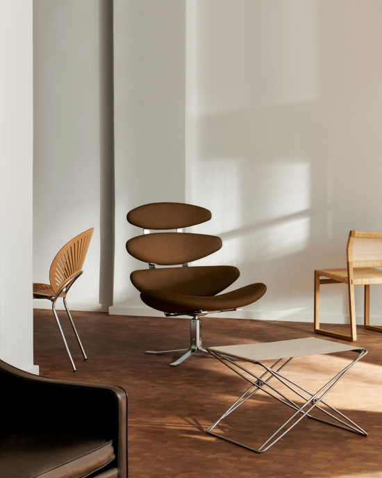In einer Ära, in der Möbeldesign Innovation und Behaglichkeit vereinte, schuf Poul M. Volther 1964 den Corona Chair – ein ikonisches Stück, das durch seine skulpturale Harmonie besticht. Die ovale Polsteranordnung, die sich flexibel an den Körper anpasst, ermöglicht vielfältige Sitzpositionen und lädt zu entspanntem Rückzug ein, sei es in einem gemütlichen Salon, einem eleganten Büro oder einem zeitgenössischen Lesezimmer. Die geschwungene Form, inspiriert von natürlichen Konturen, umhüllt sanft und bietet ergonomische Unterstützung, ohne auf ästhetische Raffinesse zu verzichten. Der Corona Sessel mit hohem Rücken ist verfügbar in vielen edlen Leder- oder Stoffvarianten und passt damit nahtlos in diverse Einrichtungsstile.