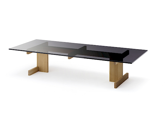 Passend zur Höhe des Sofas A-S01 und in Anlehnung an den traditionellen japanischen Chabudai-Esstisch mit kurzen Beinen kann der Sofatisch auch im Sitzen auf dem Boden genutzt werden. Die transparente Glasplatte hebt die Struktur der Beine auf ehrliche Art und Weise hervor und zelebriert das Material.