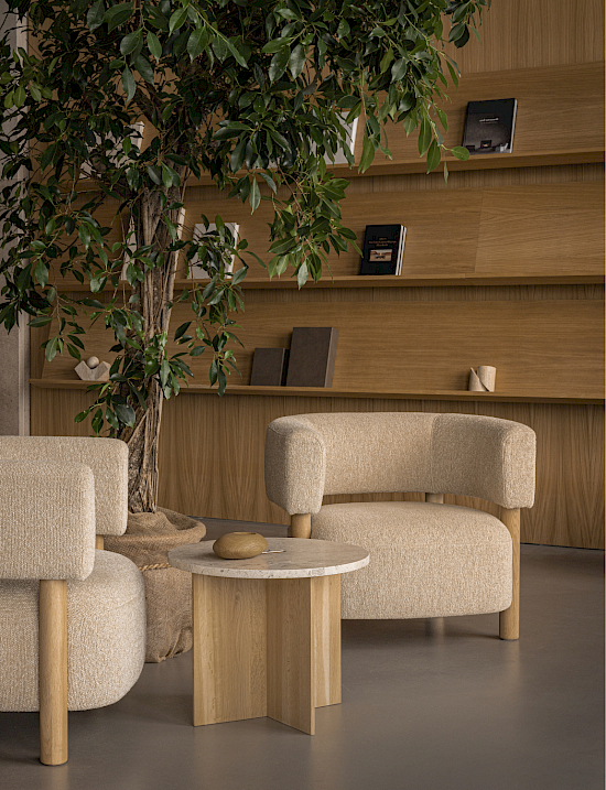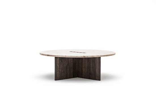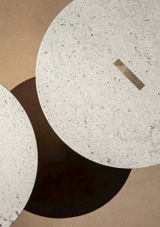 Ähnlich wie bei Esstisch und Schreibtisch gibt es beim Beistelltisch N-ST01 ein Spiel zwischen leicht und schwer. Der massive Holzsockel ändert seine Dicke je nachdem, wo er stark sein muss - in der Mitte der Konstruktion, wo die Elemente aufeinandertreffen, ist er am stabilsten, an den Enden am dünnsten. So entsteht ein visuell leichterer Ausdruck, ohne dass er an Stärke verliert. Die abgerundete Marmorplatte hebt den darunter liegenden Holzsockel durch einen subtilen Ausschnitt hervor, der die Beziehung zwischen den Materialien unterstreicht und die Richtung angibt.