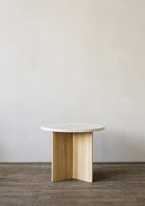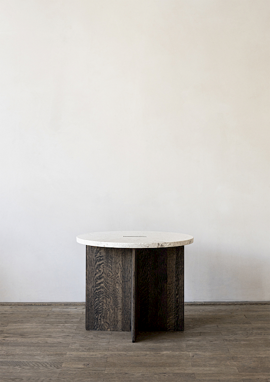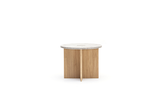 Ähnlich wie bei Esstisch und Schreibtisch gibt es beim Beistelltisch N-ST01 ein Spiel zwischen leicht und schwer. Der massive Holzsockel ändert seine Dicke je nachdem, wo er stark sein muss - in der Mitte der Konstruktion, wo die Elemente aufeinandertreffen, ist er am stabilsten, an den Enden am dünnsten. So entsteht ein visuell leichterer Ausdruck, ohne dass er an Stärke verliert. Die abgerundete Marmorplatte hebt den darunter liegenden Holzsockel durch einen subtilen Ausschnitt hervor, der die Beziehung zwischen den Materialien unterstreicht und die Richtung angibt.