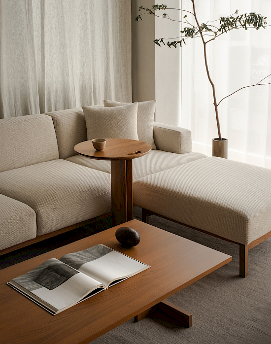 Der aus Massivholz gefertigte Beistelltisch N-ST03 verfügt über ein asymmetrisches Gestell, das so konstruiert wurde, dass es Sofas und andere Couchtische gleichermassen elegant überlappt und ergänzt. Inspiriert von den Prinzipien der Präzision und des Gleichgewichts, die in der traditionellen japanischen Architektur zu finden sind, zeichnet sich das Design durch absichtlich beabstandete Holzteile aus. Das Ergebnis ist ein Tisch mit einem optisch leichten Erscheinungsbild und einem Rahmen, der das Licht durchlässt und dem Möbel eine organische und dynamische Qualität verleiht.