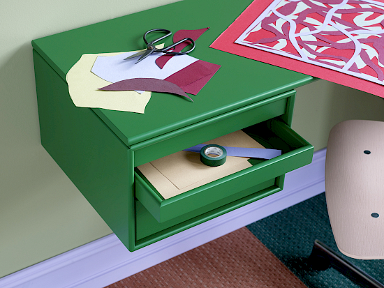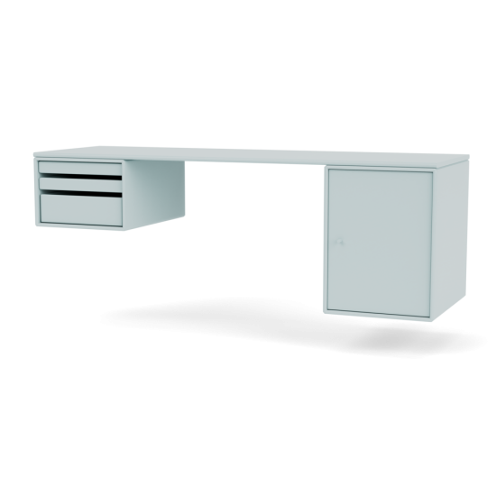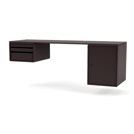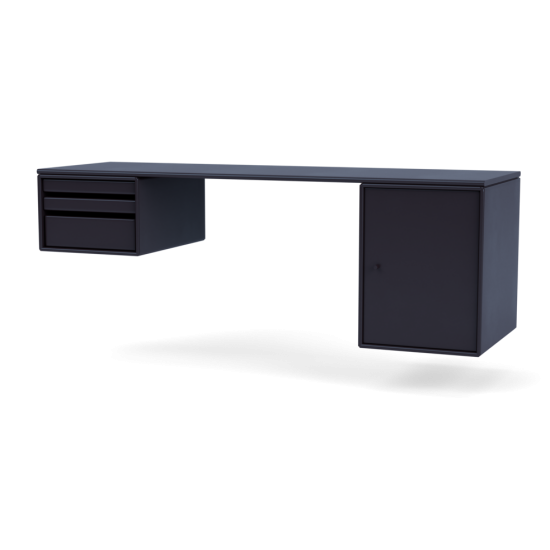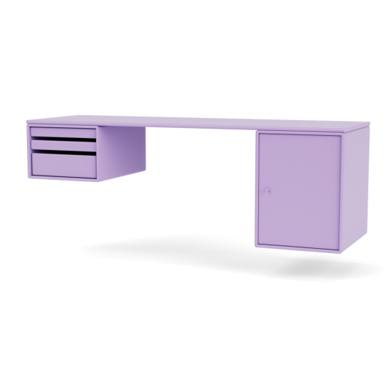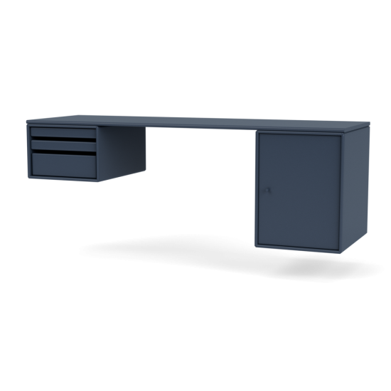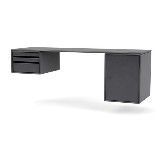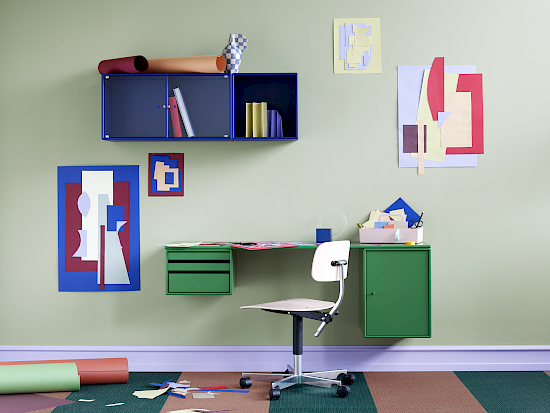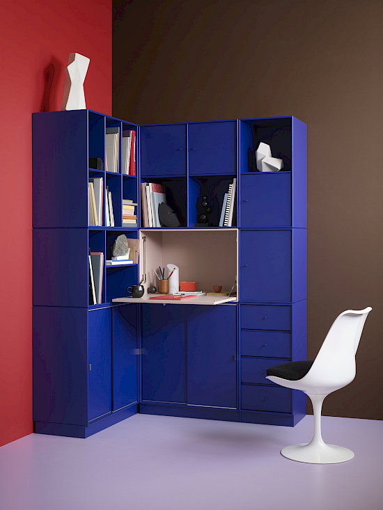 WORKSHOP ist ein länglicher Schreibtisch für das Homeoffice, der zwischen zwei seitlichen Aufbewahrungsmodulen unter der Oberplatte Beinfreiheit bietet. WORKSHOP hat an einer Seite Tablettmodule, die vollständig aus dem Modul entfernt werden können. Auf der anderen Seite befindet sich ein kleinerer Schrank zur Aufbewahrung von Büchern oder Büromaterial.