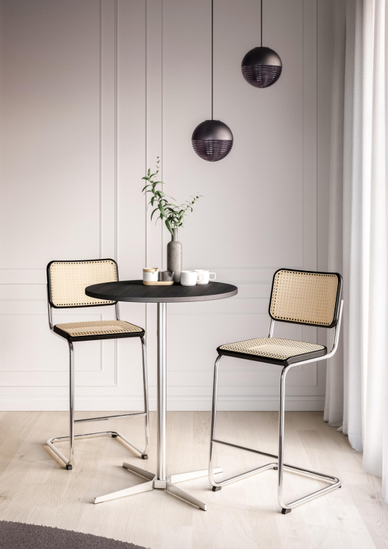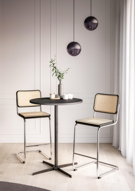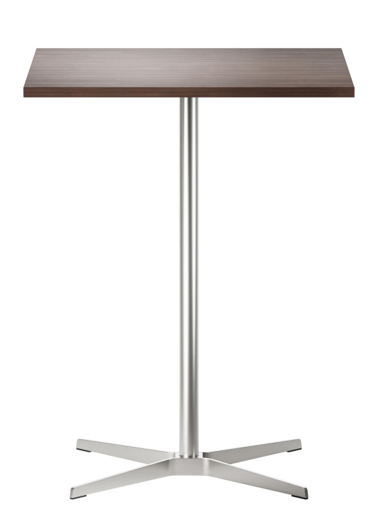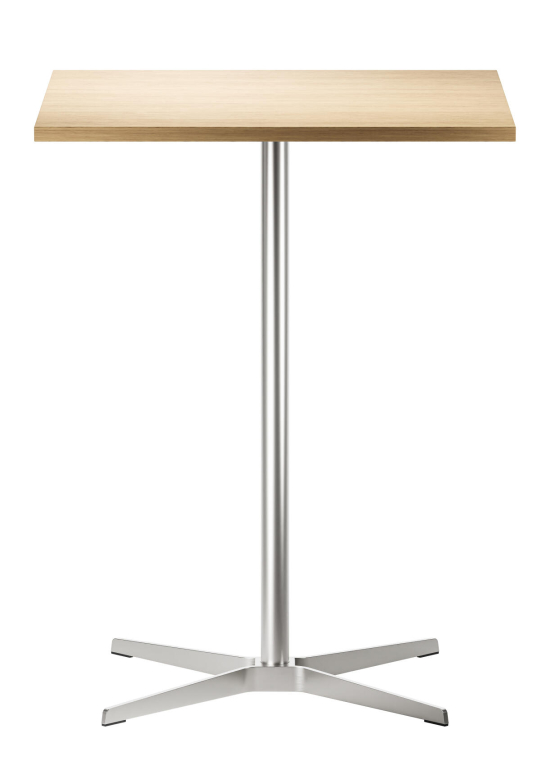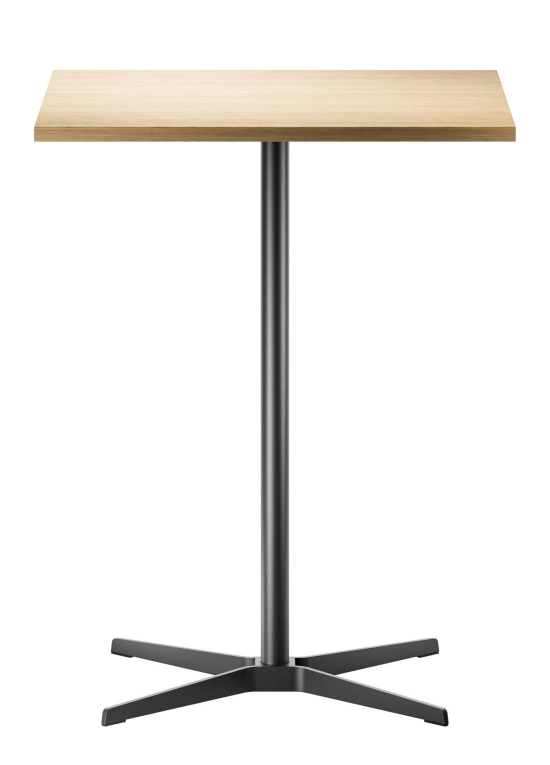Der 1828 Stehtisch, entworfen von Formstelle (Claudia Kleine und Jörg Kürschner) für Thonet, ist ein ruhiger, aber selbstbewusster Tisch. Die quadratische Platte aus Holz mit Echtholzfurnier oder Laminat ruht auf einem schlanken Kreuzfuss aus Flachstahl, der gebürstet oder schwarz erhältlich ist. Die leichte Optik des Tisches machen ihn ideal für private Küchen, öffentiche Räume, Kantinen, Restaurants oder Cafés. Die Designer haben ihn bewusst unaufdringlich gehalten, damit er sich gut mit anderen Möbeln verträgt und den Raum nicht dominiert, sondern einfach nützlich da sein soll. Thonet fertigt ihn mit Materialien, die langlebig sind und eine natürliche Oberfläche entwickeln.