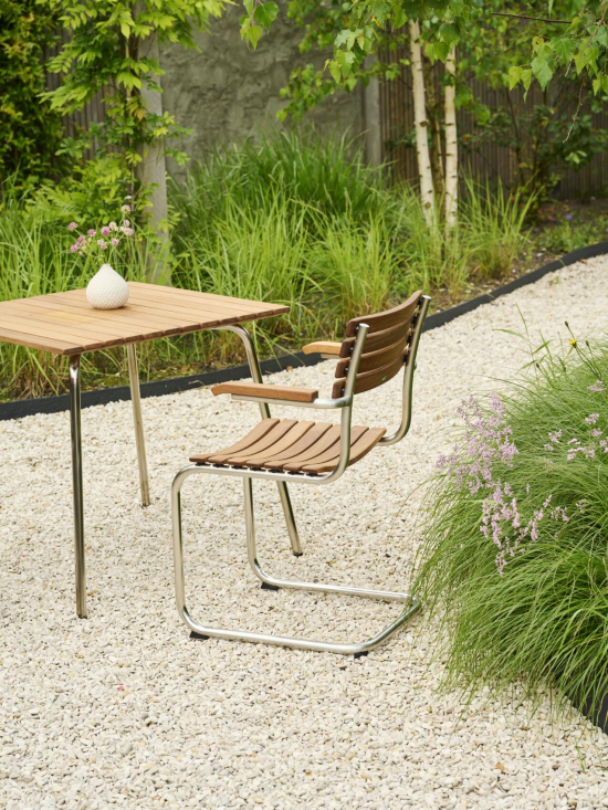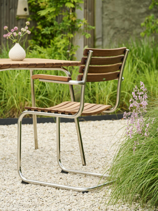 Der S 40 F Freischwinger mit Armlehnen für Draussen, entworfen von Mart Stam im Jahr 1926 für Thonet, ist ein echter Meilenstein des modernen Designs, der die Idee eines Stuhls auf das Nötigste reduziert und trotzdem bequem sitzt. Seine Sitz- und Rückenfläche aus Holz ist über ein filigranes Stahlrohrgestell montiert, das aus Edelstahl ist, und leicht schwingt, wenn man sich bewegt – das gibt ihm diesen besonderen, leichten Charme. Mit Armlehnen aus Massivholz und mit minimaler Form passt er super moderne oder zeitlose Aussenbereiche oder in Patios, wo er unauffällig, aber wirkungsvoll ist. Thonet baut ihn so, dass er Jahrzehnte hält, mit Materialien, die eine schöne Patina bekommen. Ein Stück Geschichte, das sich total natürlich anfühlt.