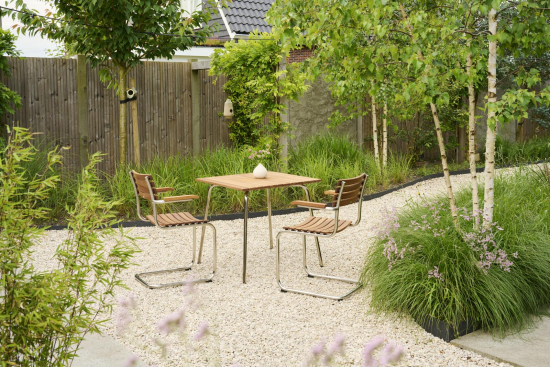 | Sitz & Rückenlehne, Armlehnen | Massivholzlatten, Iroko geölt mit farblosem Hartöl auf Basis natürlicher Rohstoffe |