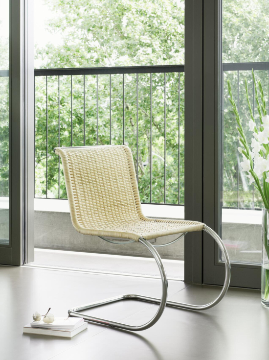 Der S 533 R Freischwinger von Ludwig Mies van der Rohe aus dem Jahr 1927 (neu aufgelegt von Thonet) ist einer der grossen Klassiker der Moderne – ein Stuhl, der mit seiner puren, fliessenden Linie aus gebogenem Stahlrohr Sitz und Rücken in einem vereint. Das Gestell ist durchgehend verchromt oder pulverbeschichtet und die Sitzfläche und Rückenlehne aus geflochtenem Rattan gibt ihm eine leichte, transparente Optik und macht ihn gleichzeitig sehr bequem. Er schwingt sanft mit, wenn man sich bewegt. Mies hat ihn bewusst reduziert gehalten – keine unnötigen Details, nur die reine Form. Ein ikonischer, zeitloser Sessel, der sich perfekt für Esszimmer, Lounges, Wohnzimmer oder Empfangsbereiche eignet.