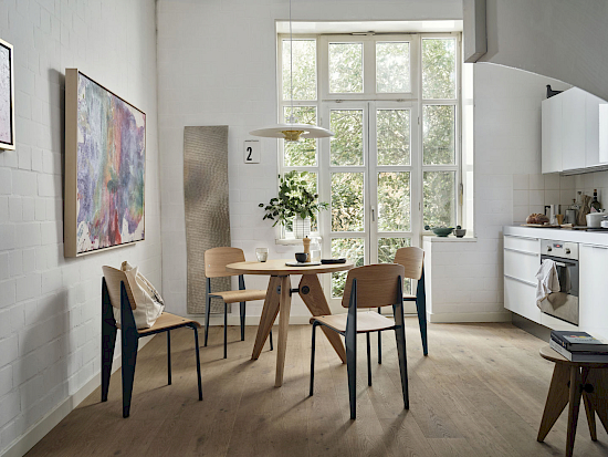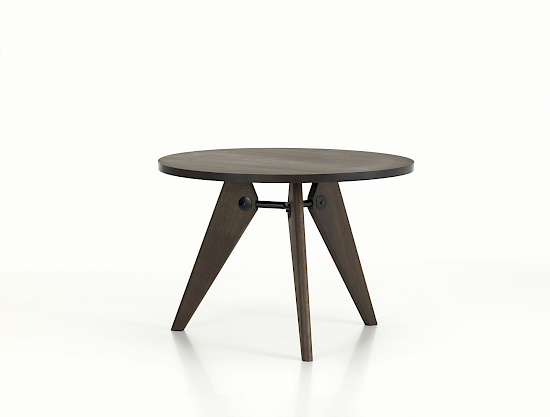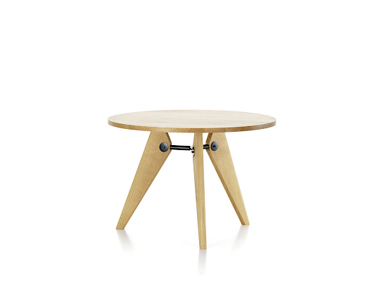Für die Universität von Paris entwarf der Designer und Konstrukteur Jean Prouvé den Holztisch Guéridon, der vor allem durch seine konstruktive Klarheit überzeugt. Er beweist, dass moderne Tische nicht zwangsläufig aus Stahl und Glas sein müssen und variiert Prouvés architektonisch geprägte Formensprache mit einem natürlichen Material.