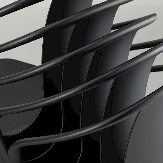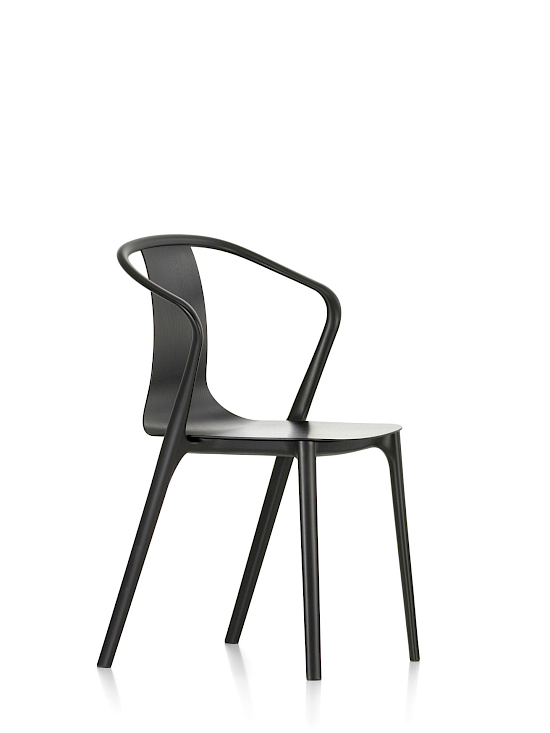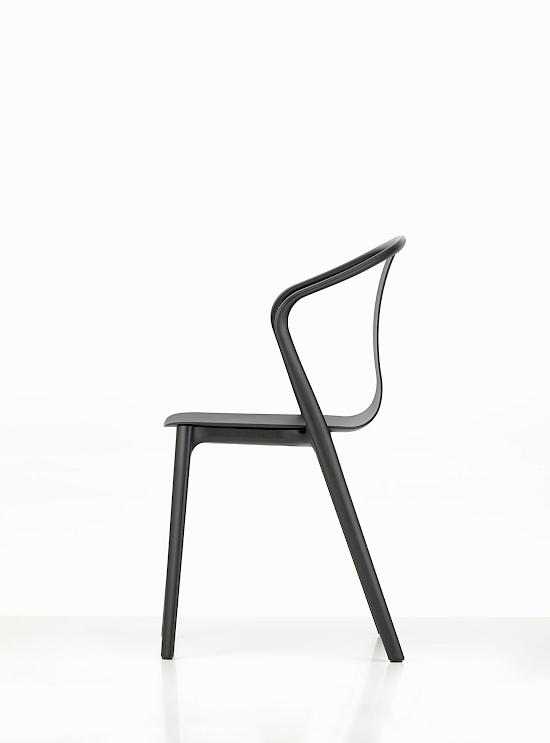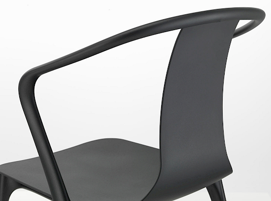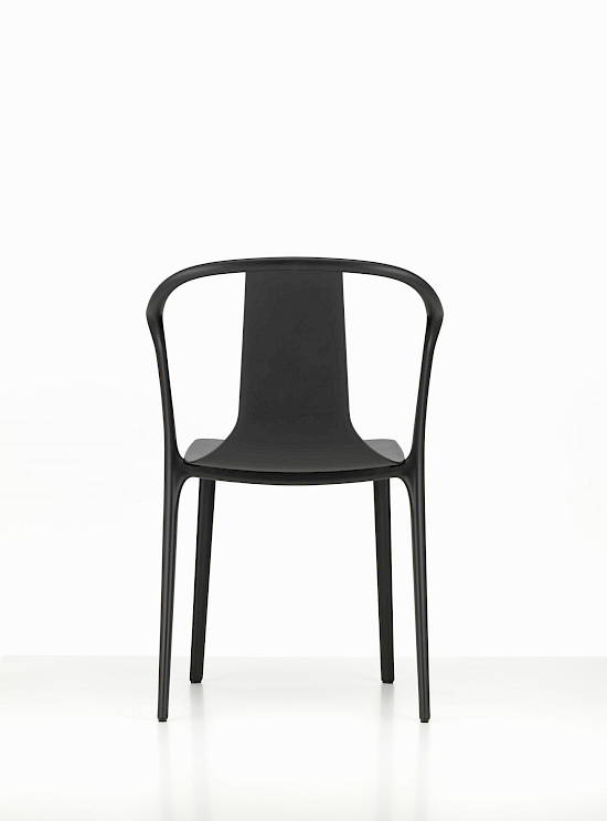 Belleville heisst das pulsierende Pariser Quartier, in dem die Designer Ronan und Erwan Bouroullec ihr Studio haben. In der klassischen französischen Bistromöblierung und in der Stimmung ihres Quartiers finden sich Anknüpfungspunkte für den Belleville Chair. Er wirkt in seiner vertrauten Form – auch im zeitgenössischen Kontext – wie selbstverständlich, gleichzeitig wohnt ihm etwas Geheimnisvolles und leicht Irritierendes inne, erschliessen sich Materialität, Konstruktion und Produktionsverfahren doch erst auf den zweiten Blick. Der Belleville Armchair ist ein technisch raffiniert aufgebauter Kunststoffstuhl aus zwei Komponenten – einer Rahmenstruktur und einer Sitzschale. Ein schlanker schwarzer Rahmen zeichnet, einer Kalligraphie gleich, Beine und Rückenleh- ne des Stuhls und nimmt eine dünne Schale auf, die sich von einem breiten Sitz zu einer schmalen Rückenlehne verjüngt. Diese Konstruktionsweise eröffnet neue Perspektiven auf die Materialität des Kunststoffstuhls, prägt doch die Fläche der Sitzschale die Identität des Belleville Armchair.