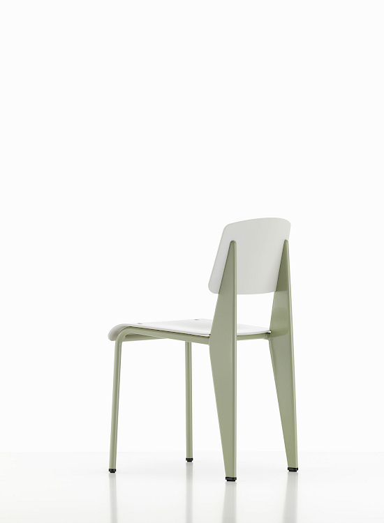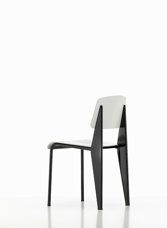Die Belastung eines Stuhls ist an den hinteren Beinen am grössten, dort wo er das Gewicht des Oberkörpers aufnehmen muss. Diese einfache Erkenntnis setzte der Designer und Konstrukteur Jean Prouvé auf prägnante Art und Weise beim Stuhl Standard um: Während für die schwächer belasteten Vorderbeine ein Stahlrohr genügt, sind die hinteren Beine des Stuhls als voluminöse Hohlkörper ausgebildet, welche die Belastung an den Boden weitergeben. Der zurückhaltende und doch ikonische Entwurf ist ein bedeutender Klassiker des französischen Designers und Konstrukteurs.