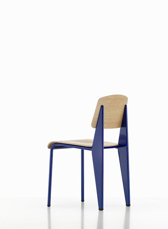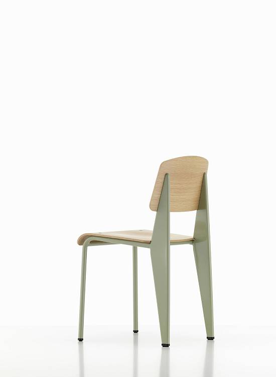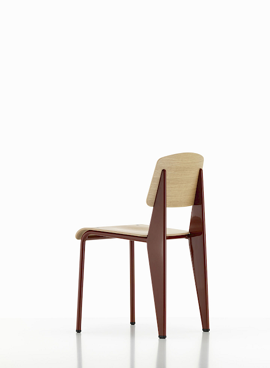 Die Belastung eines Stuhls ist an den hinteren Beinen am grössten, dort wo er das Gewicht des Oberkörpers aufnehmen muss. Diese einfache Erkenntnis setzte der Designer und Konstrukteur Jean Prouvé auf prägnante Art und Weise beim Stuhl Standard um: Während für die schwächer belasteten Vorderbeine ein Stahlrohr genügt, sind die hinteren Beine des Stuhls als voluminöse Hohlkörper ausgebildet, welche die Belastung an den Boden weitergeben. Die Sitzschale und Rückenlehne des Stuhls Standard von Jean Prouvé sind in unterschiedlichen robusten Hölzern und das unverwechselbare Gestell in verschiedenen Farben erhältlich. Der zurückhaltende und doch ikonische Entwurf ist ein bedeutender Klassiker des französischen Designers und Konstrukteurs.