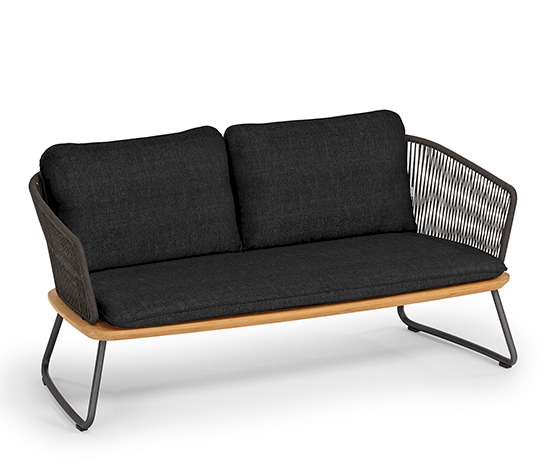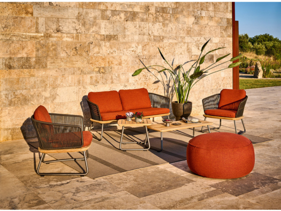 Die Kollektion Denia ist wandelbar wie ein Chamäleon. Die Möbel sind individuell einsetzbar und kommen sowohl draussen als auch in speziellen Bereichen drinnen hervorragend zur Geltung. Sessel und Sofa sehen auf der Terrasse, im Wellnessbereich – und aufgrund ihrer komfortablen Polster auch vor dem Kamin gut aus. Das Daybed wertet jede Lounge-Zone im Garten oder am Pool auf. Das Gestell ist aus Aluminium und Teakholz gefertigt, die Lehnen mit hochwertigen Textilkordeln bespannt. Passend dazu ist ein Esstisch und ein Beistelltisch erhältlich. Bei der optionalen Polsterung stehen alle Stoffe von Weishäupl zur Auswahl.