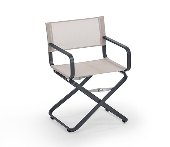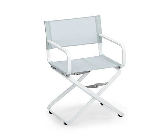Die Sessel aus der Ahoi-Kollektion erinnern an klassische Regiestühle. Ihr Korpus aus pulverbeschichtetem Aluminium, für den es verschiedene Bespannungsvarianten gibt. Das Aluminum ist wahlweise in weiss oder antrazit erhältlich und die Bespannung einfach oder gepolstert. Die Farben für die Bespannung sind schier unendlich und können dadurch sommerliche Akzente setzen oder elegant die Farben der Aussengestaltung reflektieren. Den Möglichkeiten sind fast keine Grenzen gesetzt. Zudem ist der Ahoi-Sessel sehr witterungsbeständig und ein überraschendes Leichtgewicht. Der Sessel kann platzsparend oder für den Transport zusammengeklappt werden.