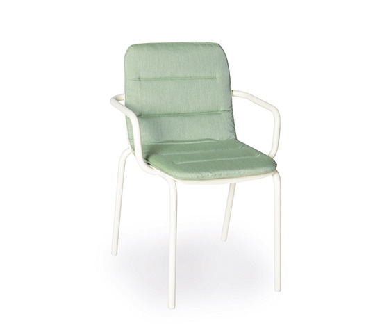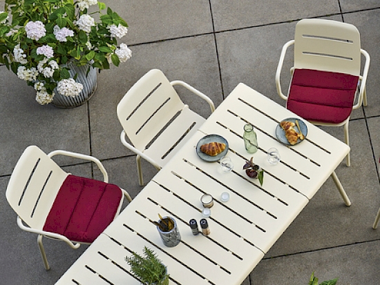Mit seiner schlichten Eleganz gelingt der Kollektion Vapio von This Weber der Spagat zwischen mondänem Flair und heimeliger Behaglichkeit. Die klaren Linien, kühnen Schwünge und die mediterrane Leichtigkeit unterstreichen das Ambiente moderner (Terrassen-)Architektur. Ebenso gekonnt setzt die Aluminium-Kollektion gefällige Kontrastpunkte in traditionellen Objekten. Neben dem Gartensessel mit Lehne gibt es den einfachen Gartenstuhl. Optional sind komfortable Polster erhältlich, die als bequemer Blickfang dienen und obendrein kaum einfacher zu handhaben sein könnten. Passend zum Sessel und Stuhl enthält die Kollektion einen Aluminium-Gartentisch.